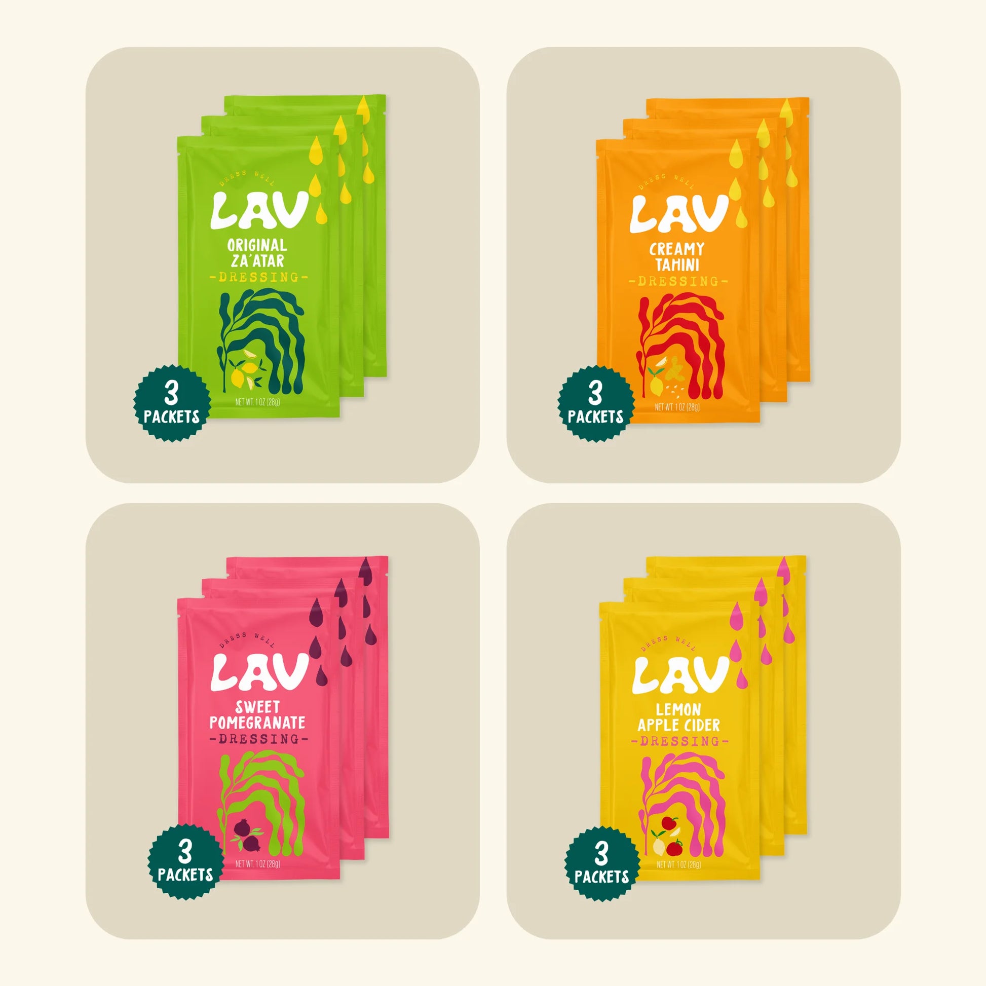 Discover your new favorite flavor trio with LAV Dress Well—a delightful sampler pack that brings together four distinct tastes in one convenient collection. Each box features 12 individual 1-oz packets: three Original Za'atar, three Creamy Tahini, three Lemon Apple Cider, and three Sweet Pomegranate. Simply tear, pour, and savor each unique blend. Perfect for exploring what you love or sharing the joy with friends. Contains sesame.